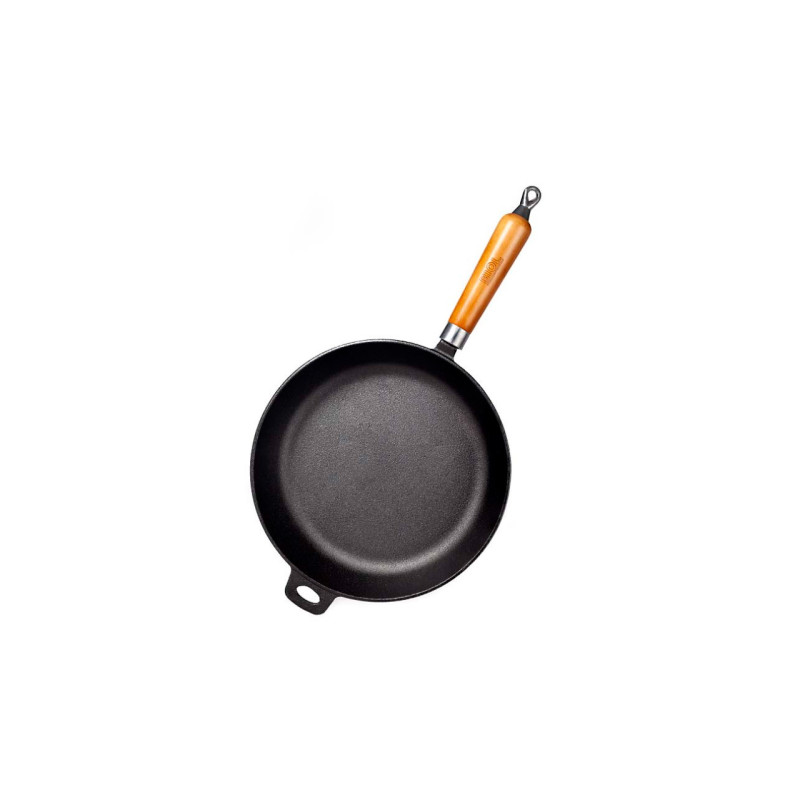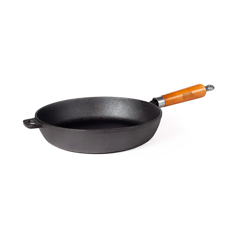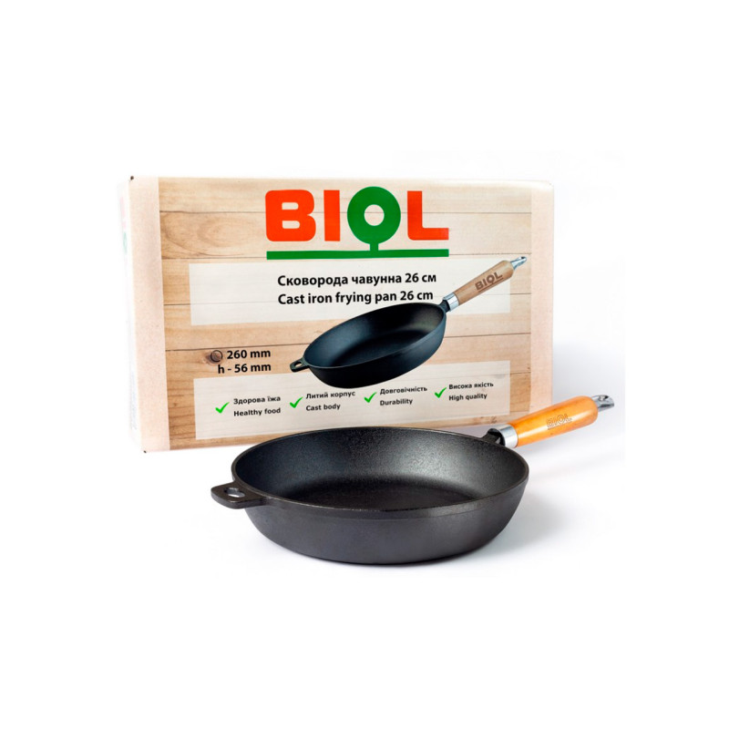 Сковорода чугунная Biol - 240мм. Классический корпус подходит для приготовления любых блюд. Высокая теплоемкость чугуна позволит получить не только аппетитную корочку, но и равномерное приготовление всего блюда. Деревянная ручка значительно упростит эксплуатацию этой сковороды.