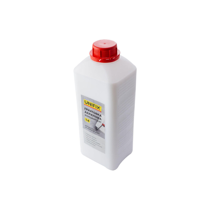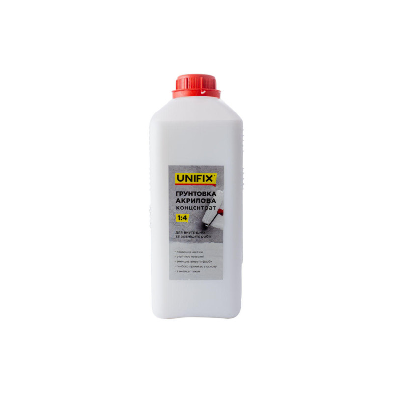 Грунтовка акриловая Unifix - 2 кг x 1:4 концентрат предназначена для грунтования большинства видов стен и потолков (бетон, штукатурка, гипсовые плиты и т.д.) перед последующей покраской, шпаклеванием, облицовкой плиткой и поклейкой обоев. Улучшает адгезию, укрепляет поверхности, уменьшает расход краски, с антисептическим действием. Рекомендуется как добавка в строительные растворы для улучшения их клеевых и эластичных свойств.