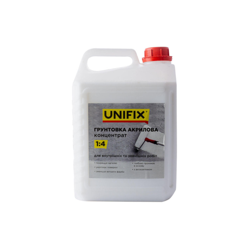Грунтовка акриловая Unifix - 5 кг x 1:4 концентрат предназначена для грунтования большинства видов стен и потолков (бетон, штукатурка, гипсовые плиты и т.д.) перед последующей покраской, шпаклеванием, облицовкой плиткой и поклейкой обоев. Улучшает адгезию, укрепляет поверхности, уменьшает расход краски, с антисептическим действием. Рекомендуется как добавка в строительные растворы для улучшения их клеевых и эластичных свойств.