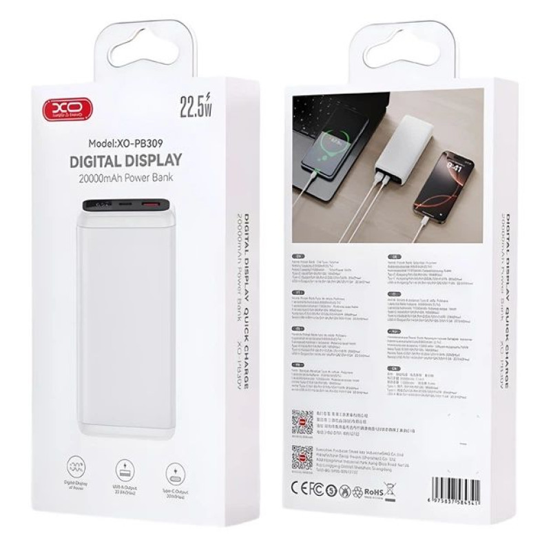 Універсальна мобільна батарея 20000 mAh XO PB309 22.5 W повербанк з дисплеєм білий
