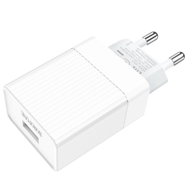 BOROFONE BA47A Mighty — класичний та практичний мережевий зарядний пристрій з одним виходом USB. Підтримує протоколи швидкої зарядки QC3.0 / QC2.0 / FCP / AFC завдяки 18 Вт вихідної потужності. Вилка стандарту EU — для усіх країн Європи. Набір без кабелю, тому для зарядки вашого гаджета потрібно мати кабель з роз'ємом USB-A з однієї сторони, та роз'ємом вашого гаджета з іншої (Micro-USB / Type-C / Lightning). Зарядний пристрій виконано з вогнестійкого пластику (PC), має міцну вилку та якісно зібраний корпус. Порт надійно зафіксований в гнізді пристрою, розрахований на тривалу роботу, сумісний з більшістю кабелів. МЗП Borofone BA47A має стабільні показники потужності, що забезпечує достатньо швидку зарядку пристрою і зводить до мінімуму можливі пошкодження.