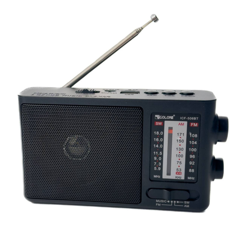Акумуляторний радіоприймач з можливістю відтворення з Usb та microSD флешки. Радіоприймач ловить на частотах FM, AM, SW. Виконано виріб із міцних матеріалів, завдяки чому прослужить довгий час. Робота радіо здійснюється від акумуляторної батареї. Діапазон частот: FM 88 –108 MHz, AM 530 – 1710 KHz, SW 3.9 – 22 MHz. Golon ICF-506BT - відрізняється гучним, якісним звуком, зручний і функціональний, має відмінний прийом радіо-сигналу.