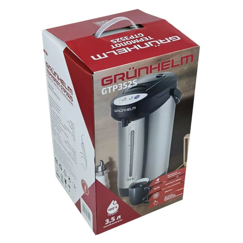 Термопот GTP352S Grunhelm має велику ємність 3.5 л, що дає можливість використовувати його під час вечірок, заходів або пікніків. За допомогою термопоту можна підігріти воду, що охолола, з функцією "повторне закипання". Гаряча вода подається за допомогою вбудованого насоса, достатньо поставити чашку та натиснути кнопку.