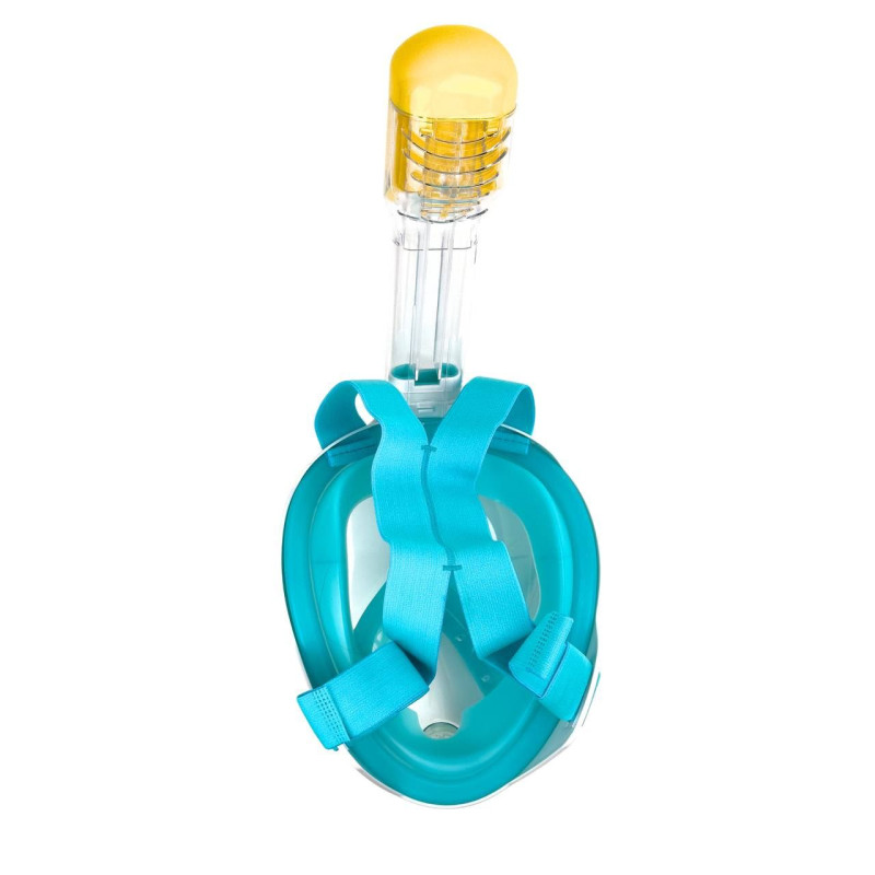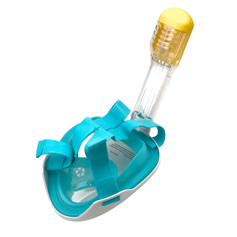 Інноваційна маска для снорклінгу (плавання з ластами на поверхні) завдяки своїй формі забезпечує відмінне поле зору в 180°, при цьому має унікальну систему вентиляції для запобігання запотівання. У масці можна дихати і ротом, і носом. Це дуже важливо для новачків у підводному плаванні. На відміну від традиційних трубок, маска має зливальний клапан у нижній частині, який не дозволяє потрапляти воді під час хвиль чи пірнанні до 3 метрів. Система Dry Top розроблена, щоб уникнути попадання води в трубку під час хвилі або коли користувач занурює голову надто глибоко, спостерігаючи за підводним світом. У трубці знаходиться спеціальний поплавець, який при зануренні під воду піднімається до верхньої частини і закупорює верхній отвір трубки. Текстильний ремінець на гумовій основі дозволить одягати маску хлопцям та дівчатам, не переживаючи за "видирання" волосся, як у класичній масці з гумовим ременем. Прилягання маски регулюється в 4-х точках, на відміну від класичної маски, де можна регулювати лише 2 точки прилягання до обличчя.