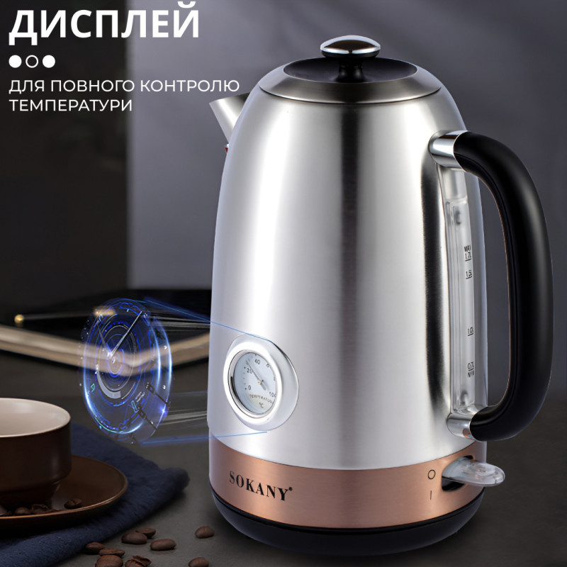 Электрочайник Sokany - это удобный и надежный кухонный прибор, который обеспечивает быстрое и комфортное кипячение воды для приготовления чая, кофе или других горячих напитков. Изготовлен из прочной нержавеющей стали, он выглядит стильно и прослужит долгое время. Благодаря высокой мощности, чайник быстро приводит воду в кипение, что экономит ваше время и позволяет быстро наслаждаться горячими напитками. Объем чайника составляет 1,7 литра, что позволяет приготовить достаточно большое количество горячей воды для всей семьи или гостей. Основные характеристики чайника Номинальная мощность 2200 Вт. Вместительность 1.7 литра. Встроенный термометр. Защита от ожогов. Автоматическое отключение. Электрочайник оснащен удобным термометром, который позволяет контролировать температуру воды и добиваться оптимальной для различных напитков. Ручка чайника имеет защиту от ожогов, что обеспечивает безопасную и комфортную эксплуатацию устройства. Чайник автоматически отключается после закипания воды или при вынимании с подставки, что обеспечивает дополнительную безопасность и экономию энергии. Электрочайник Sokany станет незаменимым помощником на вашей кухне, предоставляя быстрый и удобный способ получить горячую воду для приготовления различных напитков.
