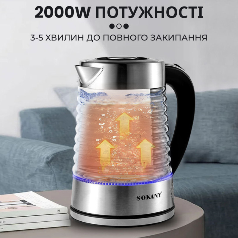 Электрочайник Sokany SK-1027 - это стильный и функциональный прибор, который сделает процесс приготовления горячих напитков простым и удовлетворяющим всем вашим потребностям. Он обладает рядом удобных особенностей, которые позволяют наслаждаться горячим чаем или кофе в любое время. Основные характеристики: Стеклянный корпус. Прозрачный стеклянный корпус позволяет видеть уровень воды внутри чайника, что удобно для контроля и заполнения воды. Подсветка. Элегантная подсветка внутри чайника придает ему стильный и современный вид, особенно в условиях темного помещения. Бесшумный режим. Инновационная технология шумоподавления обеспечивает тихую и комфортную работу, что особенно актуально утром или вечером. Вместительность 2,2 л. Большой объем чайника позволяет приготовить достаточно горячей воды для всей семьи или гостей. Высокая мощность 2000 Вт. Высокая производительность чайника обеспечивает быстрое закипание воды, экономя ваше время. Эргономичная ручка. Комфортная ручка позволяет удобно держать и переносить чайник. Автоматическое отключение. Чайник автоматически отключается при закипании воды, что обеспечивает безопасность использования и экономию электроэнергии. Вращение на 360 градусов. Удобная база с вращением на 360 градусов обеспечивает удобство использования и позволяет устанавливать чайник в любом положении. 9. Защита от перегрева и отключение при отсутствии воды. Встроенные механизмы защиты обеспечивают безопасность и предотвращают повреждение чайника. Электрочайник Sokany SK-1027 - это надежный и стильный выбор для вашей кухни. Он идеально подойдет для приготовления чая, кофе или других горячих напитков, обеспечивая комфорт и безопасность при использовании.
