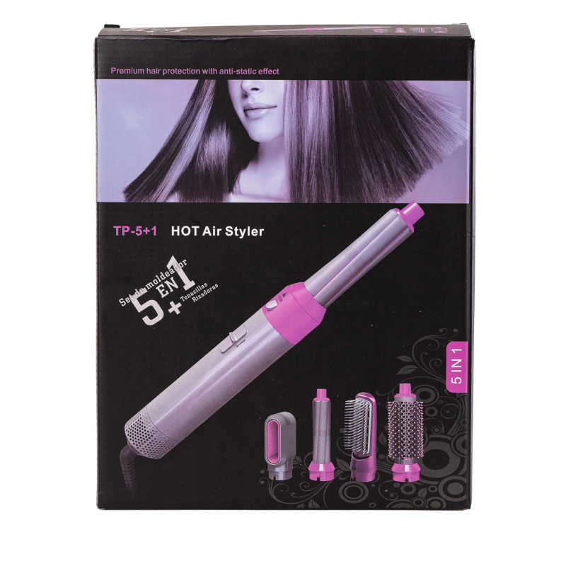 Превратите свою укладку волос с помощью многофункционального фена для волос 5 в 1. Этот стайлер предоставляет вам широкий спектр возможностей для создания различных причесок, обеспечивая ваши волосы стильным и здоровым видом. Основные характеристики: Материал: термостойкий пластик. Обеспечивает безопасное использование и длительный срок службы устройства. Потребляемая мощность: 1000 Вт. Мощный фен обеспечивает быстрый и эффективный процесс укладки волос. Количество насадок: 4 штук. Фен поставляется с разнообразными насадками, позволяющими создавать разные укладки. Длина шнура: 200 см. Длинный шнур придает удобство при использовании. Количество режимов скорости: 3. Различные режимы скорости позволяют выбрать оптимальный для вашего типа волос. Защита от перегрева. Гарантирует безопасность волос и устройства в процессе использования. Питание: от сети 220 В. Оборот на 360 градусов. Облегчает процесс укладки, обеспечивая удобство и гибкость в движениях. Комплектация: Гребень для создания объема от корней. Позволяет легко придать волосам объем и форму. Фен. Мощный фен для быстрой сушки волос. Круглая щетка-брашинг для создания больших локонов. Идеально подходит для создания больших и объемных локонов. Насадка для завивки больших локонов. Создавайте красивые большие завитки за короткое время. Насадка для завивки малых локонов. Позволяет создавать мелкие и аккуратные завитки. Инструкция. Полезная информация по использованию и уходу за устройством. Коробка. Практическая упаковка для хранения и транспортировки. Привнесите разнообразие в ваш стиль с этим удобным и многофункциональным стайлером для укладки волос.