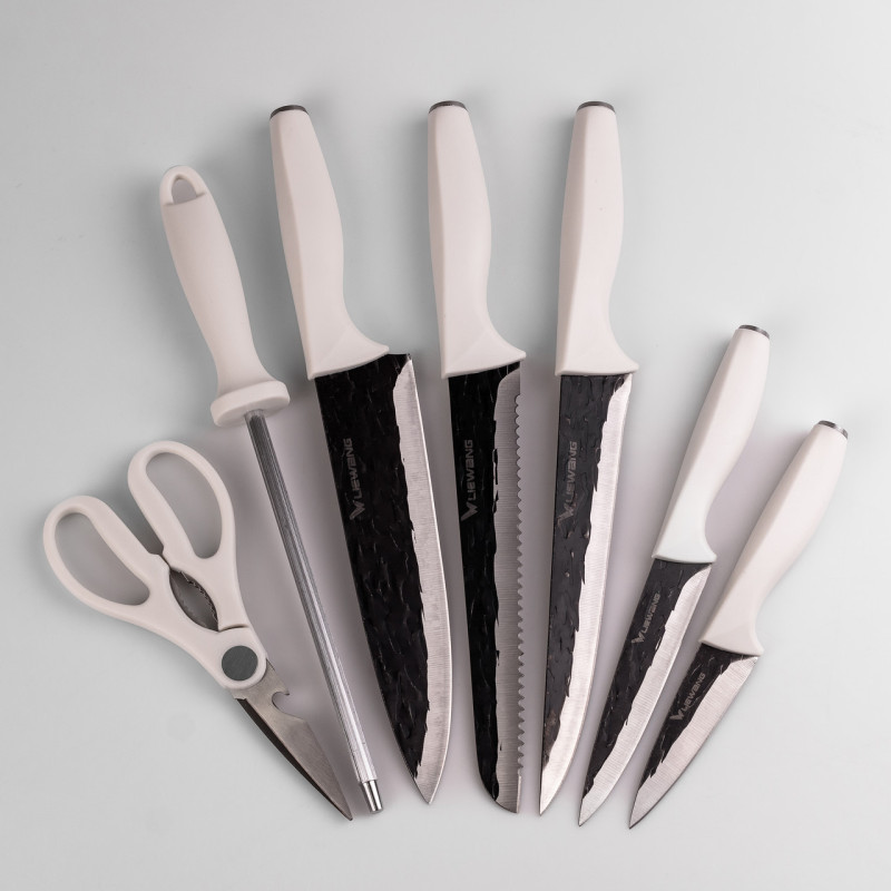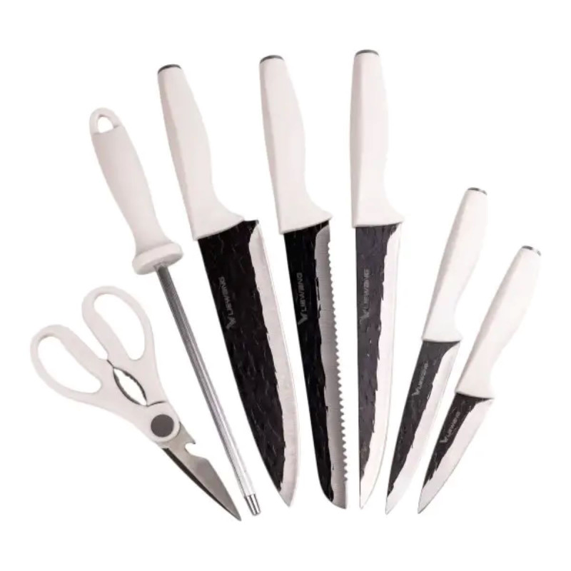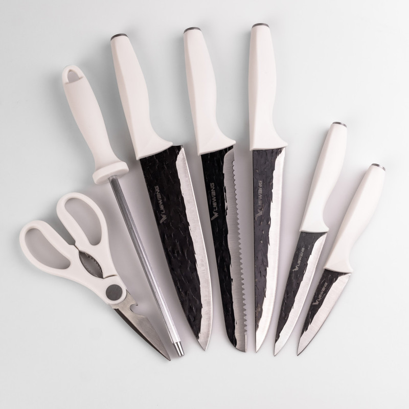 Набор кухонных ножей из нержавеющей стали – оптимальный выбор для домашнего использования. Ножи изготовлены из стали 5CR15, что обеспечивает длительную остроту благодаря алмазной заточке и углеродному покрытию, которое облегчает обработку продуктов и защищает лезвия от повреждений. Эргономичные ручки из высококачественного пластика обеспечивают удобный захват. В набор входят: Поварский нож Нож для хлеба Нож для мяса Нож для овощей Нож для чистки Мусат Кухонные ножницы Характеристики: Материал ножей: Нержавеющая сталь 5CR15 Лезвие: Алмазная заточка, углеродное покрытие Ручка: Пластик, эргономичная форма Достоинства: Длительная острота и износостойкость благодаря алмазной заточке и углеродному покрытию Наличие мусата для поддержки остроты ножей и ножниц для универсального использования Уход: Рекомендуется мыть вручную с использованием моющих средств Сушить на воздухе после мытья для предотвращения коррозии
